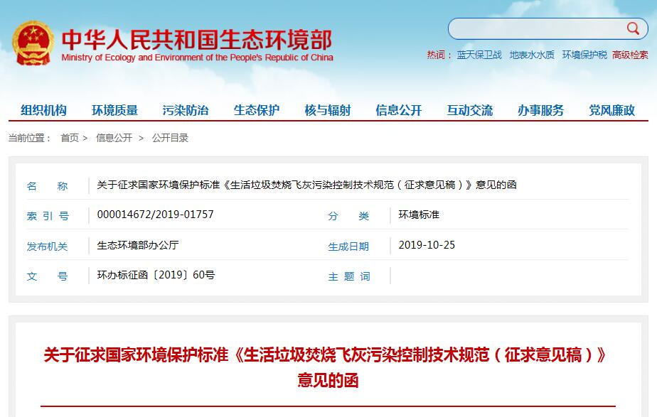 为贯彻《中华人民共和国环境保护法》《中华人民共和国固体废物污染环境防治法》等法律法规,规范生活垃圾焚烧飞灰收集、贮存、运输、利用和处置过程的污染控制,防范生活垃圾焚烧飞灰污染环境,保障人体健康,我部决定制订国家环境保护标准《生活垃圾焚烧飞灰污染控制技术规范》。目前,标准编制单位已编制完成标准的征求意见稿。根据《国家环境保护标准制修订工作管理办法》,现就该标准征求你单位意见,请研究并提出书面意见,并于2019年11月30日前反馈我部(电子文档请同时发送至电子邮箱)。标准征求意见稿和编制说明可登录我部网站(http://www.mee.gov.cn/)“意见征集”栏目检索查阅。