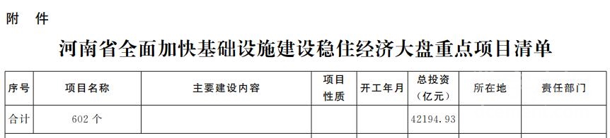 日前,根据河南省人民政府办公厅关于印发河南省全面加快基础设施建设稳住经济大盘工作方案的通知(以下简称“方案”)显示,将投资超4.2万亿元,开工建设602个重点基础设施建设项目,稳住经济大盘。