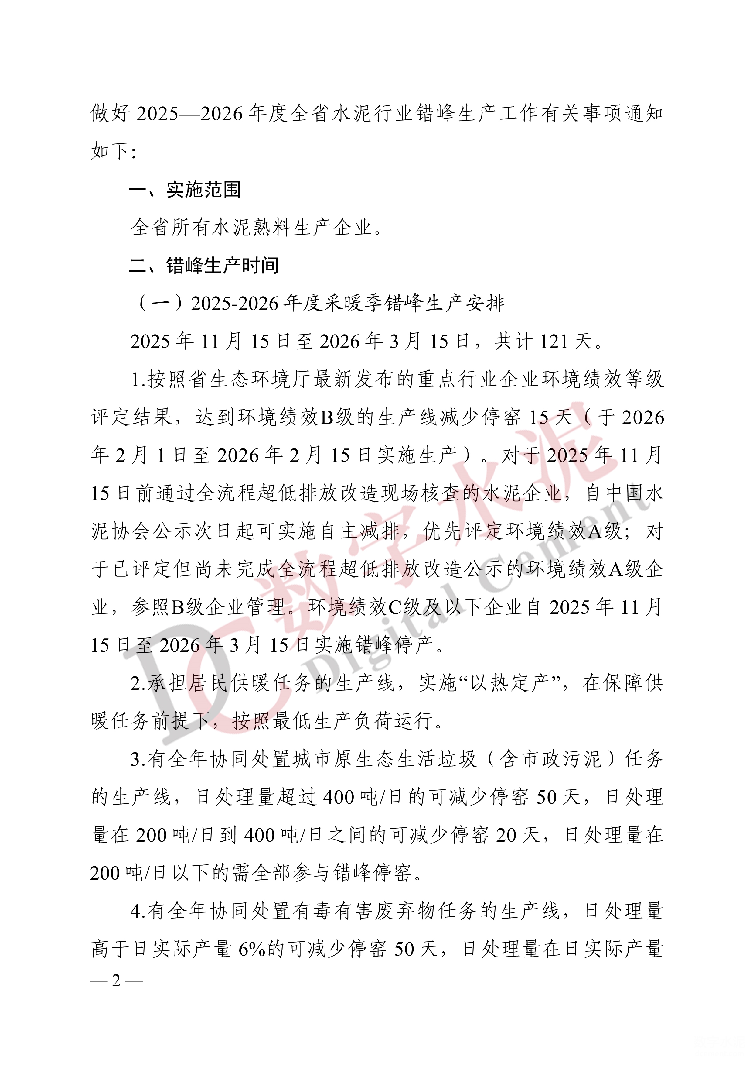 摘要:河南省所有水泥熟料生产企业2025年11月15日至2026年3月15日实施错峰生产,共计121天。