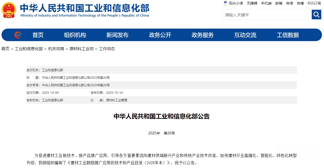 涉多项水泥技术!工信部发布《建材工业鼓励推广应用的技术和产品目录(2025年本)》