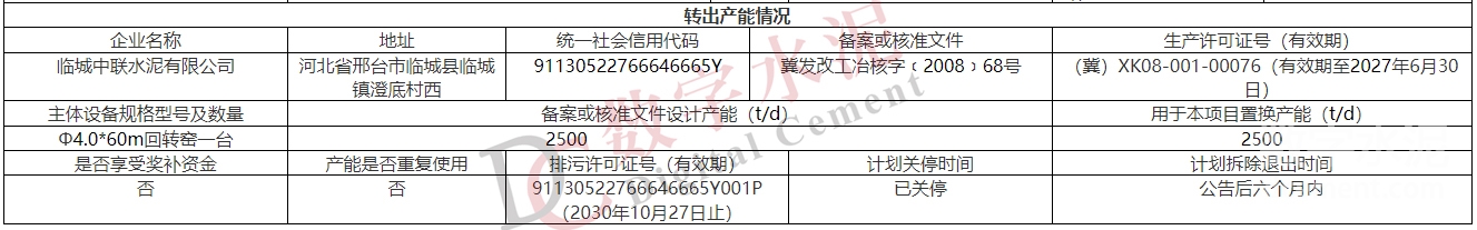 河北临城中联福石水泥熟料线项目补充产能置换方案公示
