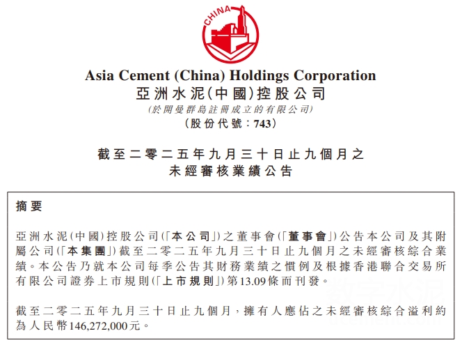 扭亏为盈!亚洲水泥前三季度净利润约为1.46亿元