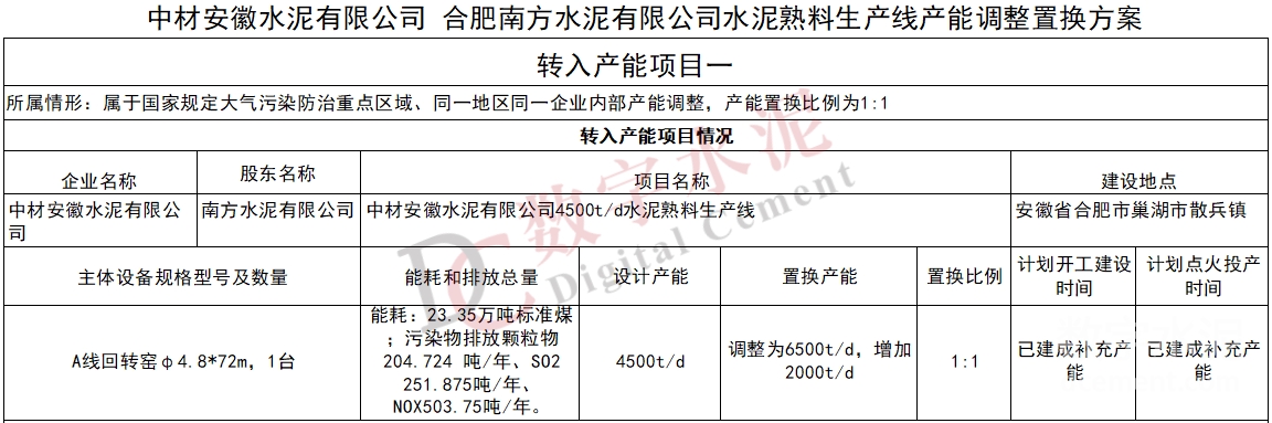 中材安徽、合肥南方水泥熟料线产能调整置换方案公示