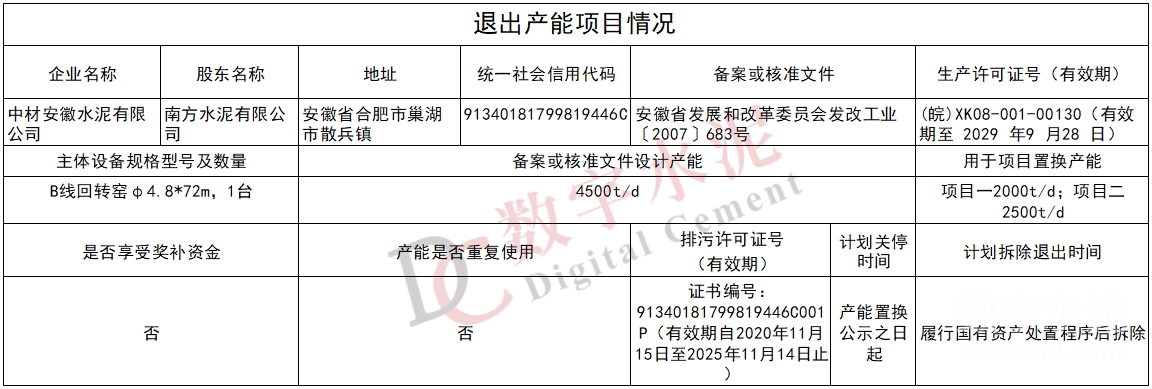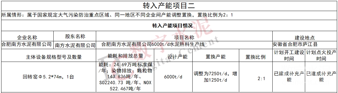 以上方案实施后,巢湖市退出1条4500t/d水泥熟料生产线。现将产能调整置换方案予以公示。